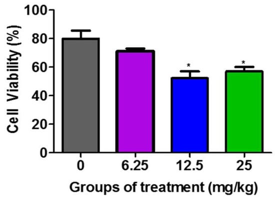 Effect of F3II tumor lysates on the viability of F3II tumor line. The murine metastatic breast tumor line F3II was incubated for 72 h with 100 µg/mL of the obtained tumor lysates from the extraction of the F3II tumor implanted in BALB/c mice treated with 6.25, 12.5 mg/kg, and 25 mg/kg of H. junceus scorpion venom. Cell viability was determined by the MTT assay. Values represent the mean ± SD of five replicates from 3 independent experiments. Significant differences * p < 0.05, with respect to the cells without scorpion venom treatment, according to one-way ANOVA and Tukey’s post-test.