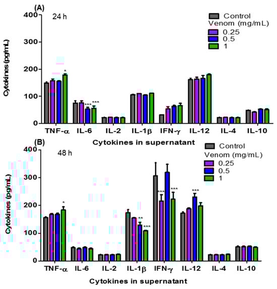 Concentrations of the pro-inflammatory and anti-inflammatory cytokines present in the culture supernatant of F3II treated with H. junceus scorpion venom. The concentration values in pg/mL of TNF-α, IL-6, IL-2, IL-1β, IFN-γ, IL-12, IL-4 and IL-10, were determined through an Immunoenzyme Assay using a commercial kit (BD OptEIA™; BD Biosciences, San Diego, CA, USA) after 24 (A) and 48 (B) hours of incubation with ¼ IC50, ½ IC50, and the IC50 of H. junceus scorpion venom. IC50: concentration values that reduce 50% of cell viability. Results are expressed as mean ± SD from 3 independent experiments with 5 replicates each one. Significant differences * p < 0.05, ** p < 0.01, *** p < 0.001, respect to the cells without treatment, according to one-way ANOVA and Tukey’s multiple comparison test (p < 0.05).