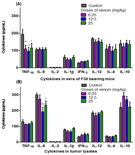 Figure 4 shows the levels of TNF-α, IL-6, IL-2, IL-1β, IFN-γ, IL-12, IL-4, and IL-10 in the sera of F3II bearing BALB/c mice treated orally with different doses of H. junceus scorpion venom (Figure 4A), as well as those in tumor lysates (Figure 4B). A significant decrease in the levels of TNF-α present in the sera of BALB/c mice implanted with the F3II tumor was observed when treated with 6.25 (p < 0.01); 12.5 (p < 0.01) and 25 mg/kg (p < 0.05) of H. junceus scorpion venom (Figure 4A). No statistically significant differences (p > 0.05) were observed between the levels of IL-6, IL-2, IL-1β, IFN-γ, IL-12, IL-4 and IL-10 present in the sera of tumor-bearing mice treated with the venom compared to the untreated control group (Figure 4A). Meanwhile, of all the cytokines evaluated in the F3II tumor lysates, IL-6 was the only one that showed a significant decrease in tumor lysates in the groups treated with 12.5 mg/kg (p < 0.001) and 25 mg/kg (p < 0.05) of H. junceus scorpion venom (Figure 4B).