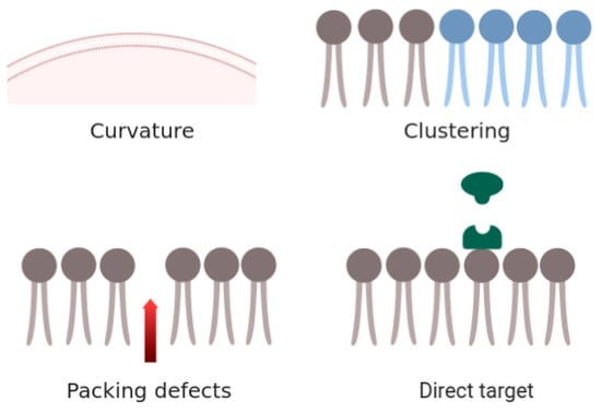 Bioactive peptides owe their activity to their membrane perturbation abilities. The most common mechanism of targeting a cell membrane by antimicrobial agents is through altering its bulk properties [9,10,11], such as membrane curvature [12,13,14,15], lipid clustering [16,17,18], packing defects [19], or direct targeting [20,21] (Figure 1). The membrane curvature and the intrinsic curvature of each monolayer of the cell membrane have been associated with the action of many antimicrobial peptides in terms of modulating their potency. The ability to introduce curvature by short peptides may even be correlated with the introduction of membrane thinning when the peptide is in a transmembrane orientation, as in the case of trichovirin-XII [22].