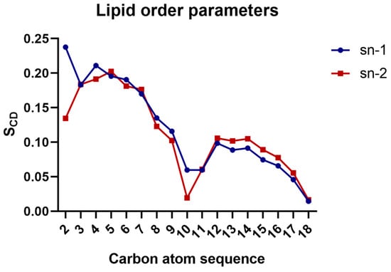 The lipid order parameters of the acyl chains were also determined, which can be directly compared with the experimental SCD values. SCD is a measure of the relative orientation of the C-D bonds with respect to bilayer normal and can be calculated as |SCD| = 0.5 <3cos2θ − 1>, where θ is the angle between bilayer normal and the vector joining Ci to its deuterium atom, where <> means the average of all lipid molecules. All contributions from conformational disorder, local tilting known as lipid wobble, and collective motions constitute the SCD parameter and thus, can be a measure of membrane fluidity [32,33].