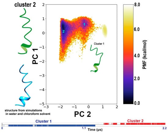 In this work, no restraints were placed on peptide conformation and, therefore it was important to observe the structural changes in the peptide over the course of the simulation. We carried out a dihedral-based PCA to obtain the free energy landscape of the peptide structure observed during the interaction with the bilayer membrane. The PCs calculated based on the un-reweighted (boosted) trajectory resulted in two distinct minimum energy wells corresponding to two distinct conformations. However, when the free energy landscape is reweighted, only one of the conformation clusters appears in the energy minimum, while the other is observed at a very high energy. In other words, upon reweighting, i.e., removing the effect of boost energy from the simulation, the real potential energy surface revealed only one energetically stable conformation for TPN in a bilayer membrane. This conformation is a linear, coiled structure with a 310 helix at the C-terminus, which was reported in our previous work as cluster 2 obtained from simulations in water and cluster 1 from simulations in chloroform [8] (Figure 6).