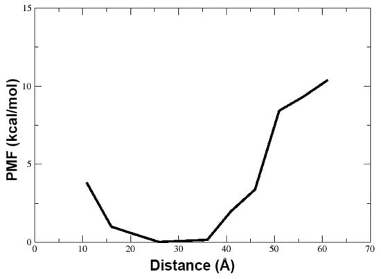 We also calculated the potential-of-mean-force (PMF in kcal/mol) by reweighting the distribution of the distance (in Å) calculated between the center-of-mass of the peptide and the center of the membrane (Figure 7). This distance includes the solved state of TPN in water to its journey to the hydrophobic core of the membrane. We observed that the energy minimum of this distance lies at 25 to 35 Å. It is known that the general width of the hydrophobic core of the membrane is 30–40 Å while the full bilayer thickness can vary from 75–100 Å. During our simulation, we observed that the TPN peptide remains bound to the surface containing lipid heads with some portions inserted within the hydrophobic region of the membrane. The PMF values also confirm that the most stable peptide configuration is found at a distance of 25 to 35 Å from the membrane center, which is the surface. The PMF rises sharply when the distance increases above 40 Å implying a high energy state of the peptide when above the membrane. If we compare these results with snapshots shown in Figure 4, we can say that the latter third of the simulation when the peptide has stabilized at the membrane surface without insertion and takes a linear form is its most stable state observed during this simulation.