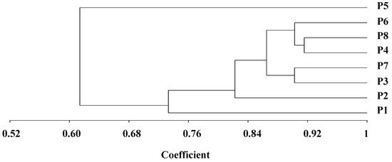 The genetic distance determined by SSR markers differed from 0.08 to 0.46, with an average of 0.23 (Table 3). The uppermost genetic distance was detected between P1 and P5 (0.46). On the other hand, the lowest genetic distance was determined between the two parental lines P4 and P8 (0.08). The dendrogram constructed from the genetic distance matrix separated the genotypes into three main clusters, with internal sub-clusters exhibiting contrasting degrees of diversity (Figure 1). Group 1 included P5. Group II comprised seven genotypes, which were divided into two sub-groups. The first sub-group included P1, and the second sub-group retained five genotypes, which were subdivided into two sub-sub clusters. The first one comprised P3 and P7, while P4, P6, and P8 formed the second one.