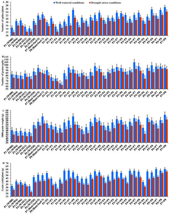 The performance of evaluated parental genotypes and their F1 crosses displayed great variations for all evaluated traits under well-watered and stressed conditions. In response to drought stress, all evaluated genotypes exhibited an acceleration in heading by 6.54 days compared to well-watered conditions. The parent P5 and the hybrid P4 × P8 exhibited the earliest heading, while P2 and the hybrid P2 × P3 showed the latest heading under both treatments (Figure 2A). Drought stress resulted in a significant reduction in plant height by 7.5% compared to normal conditions. The parent P7 and hybrid P1 × P2 had the tallest plants, while the shortest plant height was assigned for P5 and P2 × P8, P5 × P8, and P5 × P6 under drought stress and normal conditions (Figure 2B). Likewise, spike length decreased by 25.83% under drought stress. The parental genotype P7 and hybrids P3 × P4 and P2 × P4 exhibited the longest spike under both treatments (Figure 2C). Likewise, the number of spikelets/spike was reduced by 18.25% due to water-deficit conditions. The parent P8 and the crosses P2 × P3, P2 × P8, and P2 × P7 recorded the highest values of spikelet number per spike under both irrigation treatments (Figure 2D). The number of spikes per plant was reduced by 17.8% due to drought stress. The highest values were assigned for the parents P7 and P8 and the hybrids P5 × P8, P1 × P8, P4 × P7, and P2 × P8 under stressed and non-stressed conditions (Figure 3A). Likewise, the number of grains per spike significantly decreased by 13% under water deficit (Figure 3B). The parents P7, P8, and P6 and crosses P4 × P7, P6 × P8, and P2 × P7 showed the greatest values under normal and stressed conditions. The 1000-grain weight was substantially impacted by water deficit; it declined by 12.5% compared to normal conditions. The parents P7 and P8 and P6 had the heaviest grains; the crosses P7 × P8, P1 × P8, and P4 × P7 exhibited the heaviest weight under both treatments (Figure 3C). The grain yield was destructively influenced by water deficit; it suffered an 18.4% reduction under water-deficit conditions. The parental genotypes P6, P7, and P8 and the crosses P7 × P8, P6 × P7, P4 × P6, P2 × P7, P4 × P8, and P6 × P8 produced the uppermost grain yield under normal and water-deficit conditions (Figure 3D).