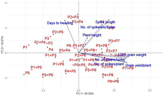 Principal component biplot for the evaluated 28 durum wheat F1s and their parental genotypes based on the studied traits under drought stress conditions.