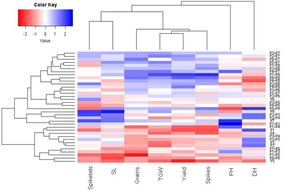 Heatmap and hierarchical clustering dividing the assessed 28 durum wheat F1s and their parental genotypes under drought stress into different clusters according to studied agronomic traits. PH: plant height, HD: days to heading, SL: spike length, spikelets: No. of spikelets per spike, Spikes: No. of spikes per plant, Grain: No. of grain/spike, TGW: 1000-grain weight, and Yield: Grain yield per plant.