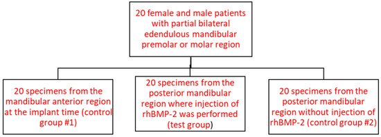 This study was a clinical and histological investigation in which 20 patients were consecutively included according to inclusion and exclusion criteria, at Lebanese University. This randomized control trial included three groups. A total of 60 gingival samples were collected (three per patient, one for each group): 20 samples from the normal gingivae of the anterior mandible region (control group #1), 20 samples treated with 0.25 µg of rhBMP-2 during guided bone regeneration (GBR) and dental implantation in the posterior mandible region (test group), and 20 samples without rh-BMP-2 administration during GBR on the opposite posterior mandible region of the same patient (control group #2) (Figure 1). The samples for control group #1 were collected from the mandibular anterior site at the time of implant placements and samples for the test group and control group #2 were collected from the posterior mandibular posterior region, during the abutment placement after 4 months of follow-up.