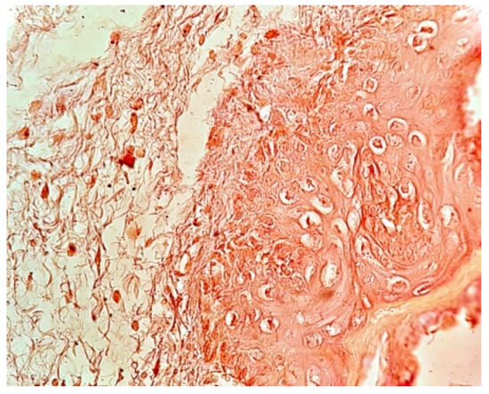 View of moderate brown staining intensity in a gingival sample, with bone graft (control group #2) without rh-BMP-2, stained with VEGF antibody. Magnification: 40×.