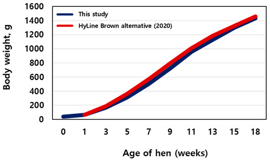 As shown in Figure 1, with advancing age in the pullets, body weight increased (blue line). The chicken body weights at different growth stages were 67.90 ± 1.47, 313.01 ± 32.40, 860.48 ± 103.86, and 1499.63 ± 101.93 g at 1, 5, 11, and 18 days, respectively. A similar trend was observed for the Hy-Line Brown alternatives (red line). No mortality was observed during the trial.