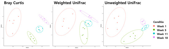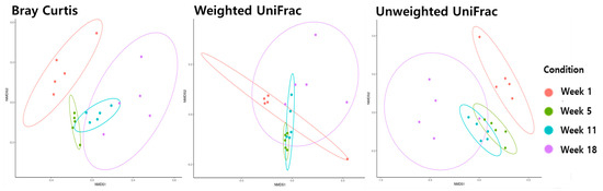The microbiota at weeks 1, 5, 11, and 18 were grouped separately on all NMDS plots (Bray−Curtis, weighted UniFrac, and unweighted UniFrac; all p ≤ 0.05) in the cecum.