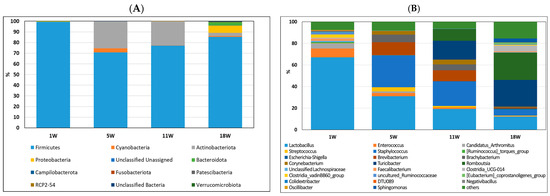 Relative abundance of bacterial composition in ileum contents at phylum (A) and genus (B) levels among different stages of pullets at 1, 5, 11, and 18 weeks. Each color represents one bacterium. The x-axis shows the age of pullets in weeks, and the y-axis shows the percentage of bacteria.