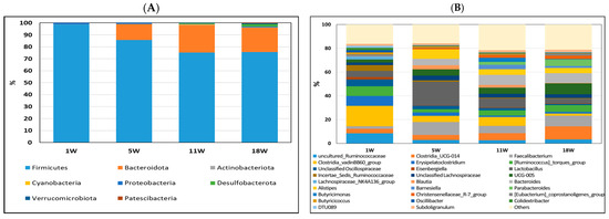 To investigate the cecum microbiota composition of pullets at different developmental stages before egg laying, the composition and abundance of the ileum (Figure 4) and cecum microbiota (Figure 5) were compared at 1, 5, 11, and 18 weeks of age. As shown in Figure 4A, the most abundant phylum in the ileum at 1 week was Firmicutes (99.60%). However, the most abundant phyla in the ileum contents at 5 and 11 weeks were Firmicutes (70.81−77.18%) and Actinobacteriota (22.51−25.81%). More diverse microbiota, including Cyanobacteria (0.92%), Bacteroidetes (3.03%), and Proteobacteria (6.66%), were found in the ileum microbiota of 18-week-old pullets. At the genus level, Lactobacillus (67.01%), Enterococcus (8.17%), and Candidatus Arthromitus (4.91%) were the major bacterial genera in pullets at one week of age (Figure 4B). However, Lactobacillus, Staphylococcus, Turicibacter, and Romboutsia were the major bacterial genera in the ileum contents at 11 and 18 weeks of age.