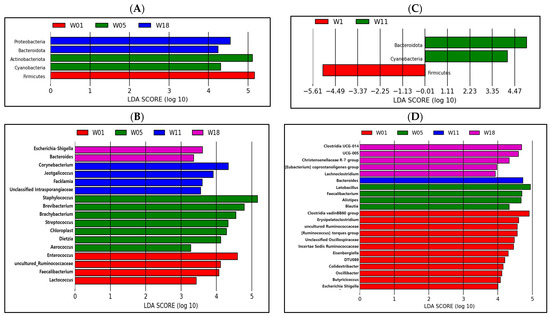 Microbe analysis of different taxa in the ileum ((A) phylum; (B) genus) and cecum ((C) phylum; (D) genus) based on the LEfSe method in pullets at 1, 5, 11, and 18 weeks. The default parameters were LDA score >2 and p ≤ 0.05. Bacteria with red, green, blue, or purple colors are higher at 1, 5, 11, and 18 weeks, respectively.
