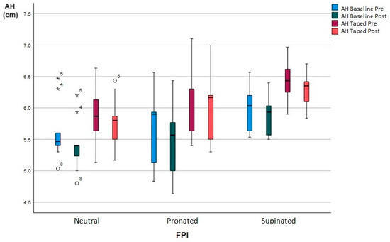 | Variable AH n = 30 | Baseline Pre Mean (cm) ± SD (95% CI) | Baseline Post Mean (mV) ± SD (95% CI) | Taped Pre Mean (mV) ± SD (95% CI) | Taped Post Mean (mV) ± SD (95% CI) | p-Value Baseline Pre vs. Baseline Post | p-Value Baseline Pre vs. Taped Pre | p-Value Baseline Pre vs. Taped Post | p-Value Taped Pre vs. Taped Post |