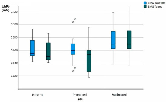 | Variable EMG n = 30 | Baseline Mean (mV) ± SD (95% CI) | Taped Mean (mV) ± SD (95% CI) | p-Value EMG Baseline vs. EMG Taped |