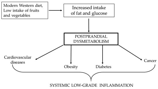 The unifying element of all these diseases is chronic systemic low-grade inflammation (Figure 1), caused by high glucose levels and free fatty acids, which trigger the production of free radicals and induce the release of proinflammatory cytokines such as interleukin-6 (IL-6) and tumour necrosis factor α (TNFα) [2,3,4,5,6]. Therefore, the aim of this review was to comprehensively analyze and summarize the correlation between aspects of the postprandial state, chronic systemic low-grade inflammation and the leading pathologies of the modern era.