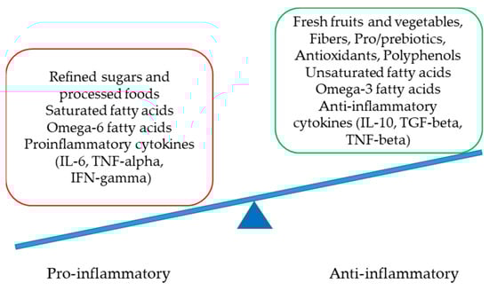 Numerous factors are involved in the delicate but complex equilibrium between pro- and anti-inflammatory statuses at the molecular level. Crucial players are presented in Figure 2.