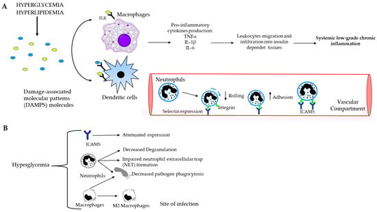 Causal connection between the immune system and postprandial dysmetabolism. (A) Systemic low-grade chronic inflammation starts with macrophages and dendritic cells, which recognize and bind DAMP molecules through toll-like receptors (TLRs). Consequently, the production of pro-inflammatory cytokines and the recruitment of immune cells to the site of the damage occur. The further spreading of the leukocytes towards insulin-dependent tissues leads to chronic inflammation. (B) Schematic representation of hyperglycemia and innate immune cells. High blood glucose level decreases rolling ability and increases the adhesion capacity of neutrophils to endothelium, impairs NET formation and decreases phagocytosis of both neutrophils and macrophages.