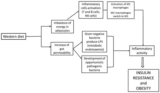 Another critical factor that triggers inflammation is the imbalance of energy in adipocytes and the increase in gut permeability, as Gram-negative bacteria produce lipopolysaccharide (LPS), which leads to an inflammatory response by binding to TLR-4 receptors located on macrophages and adipocytes [16,17].