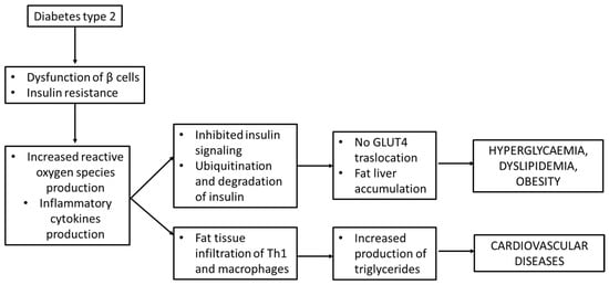 Under physiological conditions, the release of insulin produced by β cells of the pancreas follows the glycemic curve during a meal with the purpose of reducing excessive plasma glucose levels, and it is accompanied by an oxidative and inflammatory response [29]. The insulin production in T2D patients does not grow proportionally to the glycemic load but is delayed, leading to higher and longer postprandial glucose excursions. Thus, the liver and peripheral tissues are not able to stimulate the uptake of glucose [30]. This condition also affects T2D patients’ lipid metabolism, as they have high levels of very-low-density lipoproteins (VLDLs), chylomicrons (CMs) and chylomicron remnants (CMRs) and low levels of high-density lipoproteins (HDLs) [31]. The increase in VLDLs is associated with the production of low-density LDLs, a subset of LDLs with a high triglyceride content that leads to an atherogenic risk. These conditions, along with insulin resistance, impair the uptake of fatty acids into muscle and lead to an increase in postprandial fatty acids in patients with T2D [32,33]. In the following sections, the features of T2D, the factors involved in this pathology, inflammation and its interactions with other organs are analyzed.