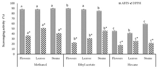 Scavenging capacity of B. ternifolia extracts based on the findings yielded by ABTS•+ and DPPH• assays based on 6.66 mg/mL extract concentration. The statistically significant differences (p < 0.05) in values obtained from different plant parts based on the ABTS•+ and DPPH• assay are denoted with a, b and c, and a*, b*and c*, respectively. The average of three independent assays ± standard deviation is shown.