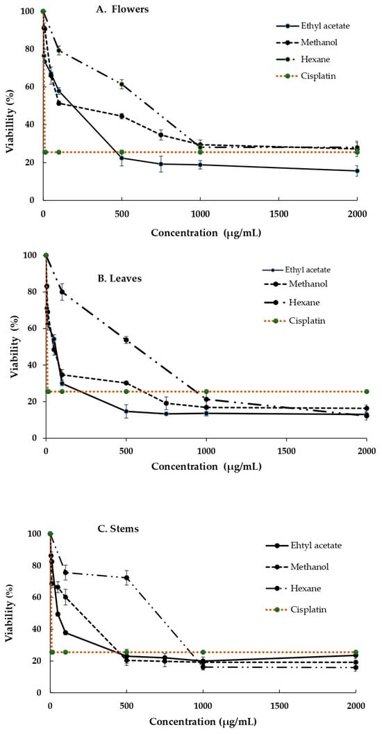 Cytotoxic effect of B. ternifolia extracts on the MDA cell line (A) Flowers, (B) Leaves and (C) stems in three different solvents. Cells were exposed for 24 h to different concentrations of extracts, and, after incubation, cell viability was measured using the MTT technique. All values are expressed as the mean ± standard deviation of three independent experiments.