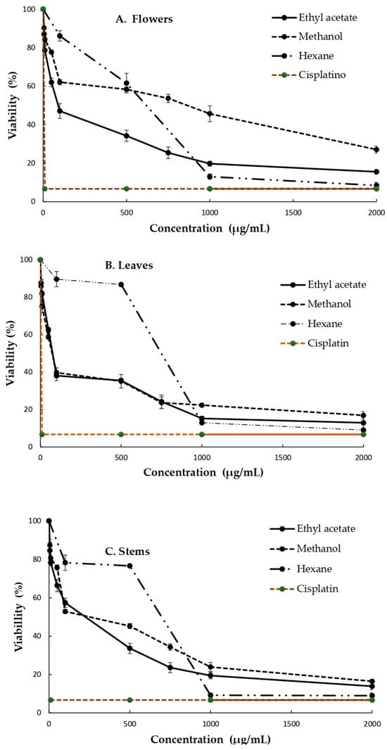 Cytotoxic effect of B. ternifolia extracts on the SiHa cell line (A) Flowers, (B) Leaves and (C) stems in three different solvents. Cells were exposed for 24 h to different concentrations of extracts, and, after incubation, cell viability was measured using the MTT technique. All values are expressed as the mean ± standard deviation of three independent experiments.