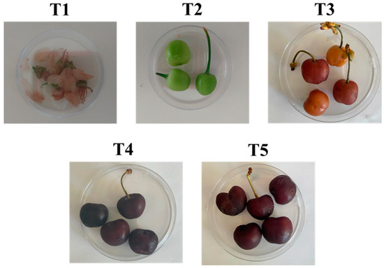 Sweet cherry fruits from the cultivar Saco, widely cultivated in the Beira region, were supplied by a producer located in the Fundão region, Portugal (40°6′54.655″ N 7°36′26.701″ W). In 2021, samples were taken five times during their development on the mornings of the days 5 April (T1), 20 April (T2), 6 May (T3), 26 May (T4), and 7 June (T5) (Figure 1), from trees aged between 5 and 7 years old, their optimum productive stage. Samples were collected from five different trees, taking 10 cherries per tree and mixing them together. The harvesting was undertaken aseptically, using gloves and immediately placing the fruit into sterile plastic tubes. Then, the samples were promptly transferred to the laboratory facilities for processing at low temperatures. Transport was performed at 4 °C in an isothermic receptacle to ensure the appropriate refrigeration of the samples. Five to ten cherries were picked to study the microorganism culturome present at each stage of maturation.