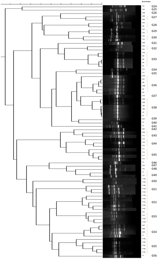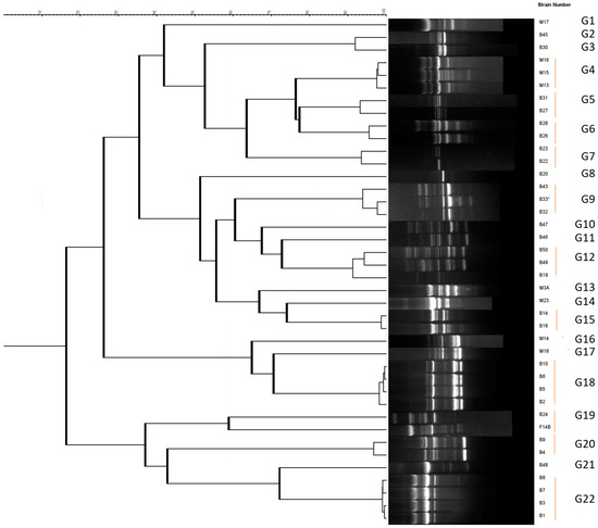 Dendrogram obtained for the bacterial strains isolated in the present study using Pearson’s coefficient and UPGMA (Unweighted Pair Group Method with Arithmetic Mean) analysis of the RAPD profiles.