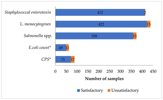 Graphical representation of microbiological results from testing of raw and thermally treated milk cheeses. * Satisfactory categorization includes acceptable samples; CPS—coagulase-positive staphylococci.