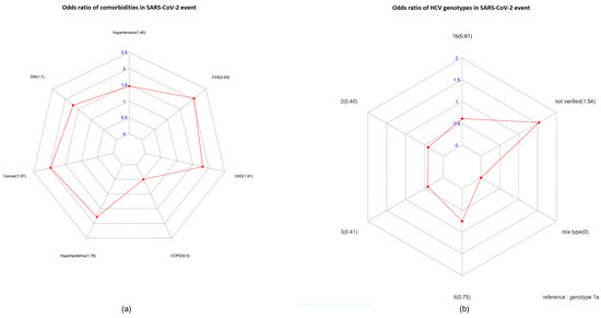 The odds ratio (OR) assay for comorbidities (a) and HCV genotypes (b) in patients infected with SARS-CoV-2, obtained using R software. (p < 0.05).