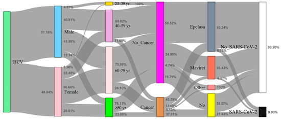 Sankey diagram depicting the distribution of HCV-infected individuals in relation to SARS-CoV-2 infection status (n = 602). The content of the figure illustrates the distribution of HCV-infected individuals concerning four variables (gender, age, cancer, and DAA medication) in relation to their SARS-CoV-2 infection status using a Sankey diagram. The description also mentions the visual elements used in the diagram, such as vertical colored bars and gray flow arrows.