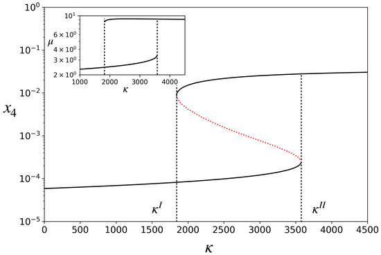 For each fixed-point attractor, the right-hand side of Equation (9) is constant. Hence, in the attractor, V grows exponentially, with constant . In other words, the protocell has a characteristic growth rate in each attractor given by the expression in Equation (9). This is shown in the inset of Figure 2. Hence, in the bistable region, the protocell can grow with two distinct growth rates depending upon which attractor it is in. The growth rate is many times higher in the active state than in the inactive one.