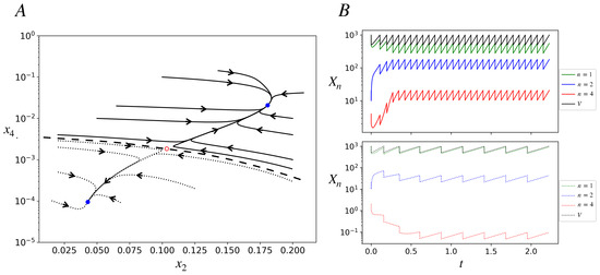 Once the concentrations have reached their fixed-point attractor, (9) implies that V grows exponentially, and Equation (8) then implies that each chemical population must also grow exponentially with the same rate, . (Only if all populations grow at the same rate as V will their concentrations be constant). Thus, in each attractor we have . In other words, the protocell naturally exhibits balanced growth in each attractor (growth with ratios of all populations constant [40]). Exponentially growing trajectories in a nonlinear system and this remarkable emergent coordination between the chemicals without any explicit regulatory mechanism are a consequence of (a) the fact that the right-hand sides of Equations (5)–(7) are homogeneous degree-one functions of the populations (if all three populations are simultaneously scaled by a factor , , then the right-hand sides of Equations (5)–(7) also scale by the same factor ), and (b) that the ACS structure couples all chemicals to each other. This is discussed in detail in Ref. [41] in the context of models of bacterial physiology.