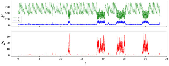 Stochastic simulation of the populations of species A(1), A(2), and A(4) for a single protocell lineage in the model. Parameter values are as in Figure 3, . Initial condition: . Note the transitions of the protocell between the inactive and active states. From a long such simulation we find that the average interdivision times in the inactive and active states are, respectively, , and , while the average residence times in the two states are , and .