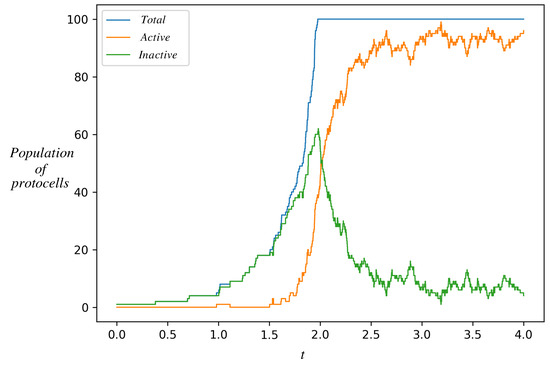 The number of protocells in the inactive state increases whenever one of them divides. Eventually, one of them makes a stochastic transition to the active state, whereupon the number of active protocells jumps from zero to one. Active protocells also make stochastic transitions to the non-active state on a certain timescale. However, since active protocells divide faster (as seen in Figure 4), their number grows faster and their population catches up and overtakes the inactive population in Figure 5. Eventually, the active protocells dominate the population.