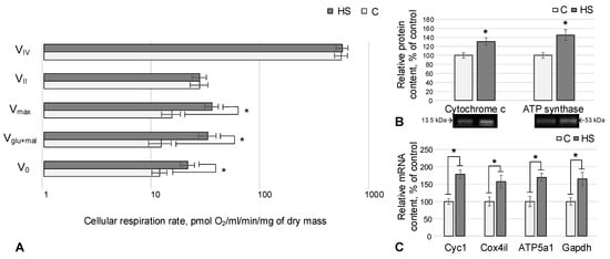 OXPHOS data and relative content of the respiratory chain proteins with corresponding mRNA content. C—control group, HS—hindlimb suspension group. *—p < 0.05 compared to the control group C. (A) Rate of cellular respiration in mouse ovaries. V0, Vglu+mal, Vmax, VII, and VIV are measured rates of oxygen uptake during substrate-inhibitor analysis (detailed description is in the Materials and Methods section). (B,C) Relative protein and mRNA content of the respiratory chain complexes: Cyc1—cytochrome c, Cox4il—cytochrome c oxidase, ATP5a1—subunit F1 of ATP synthase, Gapdh—glyceraldehyde-3-phosphate dehydrogenase.