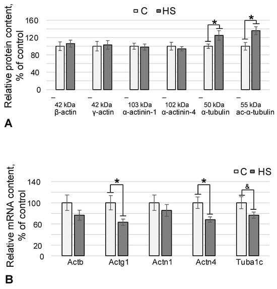 Relative content of cytoskeletal proteins and corresponding mRNAs in mouse ovarian tissues. C—control group, HS—antiorthostatic suspension group. *—p < 0.05 compared to the control group C, &—p = 0.1 compared to the control group C. (A) Protein content—beta-actin (42 kDa), gamma-actin (42 kDa), alpha-actinin-1 (103 kDa), alpha-actinin-4 (102 kDa), alpha-tubulin (50 kDa), acetylated alpha-tubulin (55 kDa). (B) Relative mRNA content of genes encoding cytoskeletal proteins Actb, Actg1, Actn1, Actn4, Tuba1c—beta- and gamma-actin, alpha-actinin-1 and -4 and alpha-tubulin, respectively.