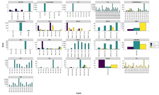 Major saccharolipids that are integral to photosynthetic membranes are mono- and di-galactosyl DGs (MGDG and DGDG, respectfully). In the case of microalga (Isochrysis galabana), we monitored both MGDGs and DGDGs (Table 5). In this regard, previous studies have demonstrated that MGDG levels in microalgae are decreased with exposure to ocean acidification [20]. As expected, these lipids were not monitored in copepods since they lack chloroplasts.