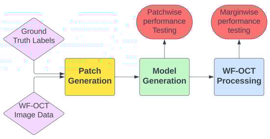 - Patch Generation: In this preliminary step, the ground truth labels are input to extract coordinates from the WF-OCT imaging data. The resulting output consists of labeled image patches, each distinctively named and characterized according to their morphological feature types. These patches are further sorted based on specific margins and unique subject directories. Concentrated data augmentation is implemented to enhance the representation of suspicious features, ensuring a balanced training dataset to the possible extent.