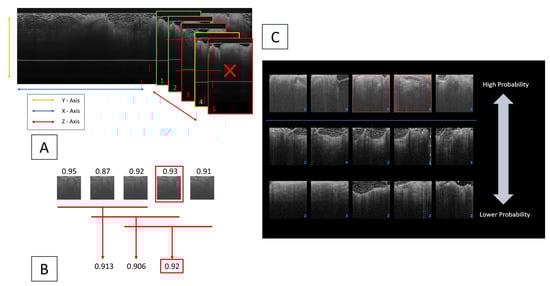 - Margin Processing: When a model fulfills the pre-defined performance criteria, it is tested in a simulated real-world environment using the WF-OCT Processing tool. This stage involves the simultaneous processing of designated and complete subject scans as well as the application of a clustering algorithm. The foremost aim is to identify correctly classified key suspicious features and ensure that the model presents the most accurate “Key Thumbnail Images” of the relevant patches to the clinical user. This method boosts user accessibility and efficiency in identifying suspicious features during surgical procedures.