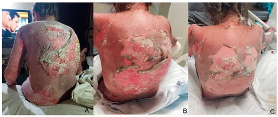 Treatment on the first day of hospitalization with extensive epidermal detachment on her back is noted in a 51-year-old female patient with TEN (A). Follow-up on day 5 showing dry skin after silver nitrate BID (B). Final photograph on day 15 before discharge with good clinical outcome (C).