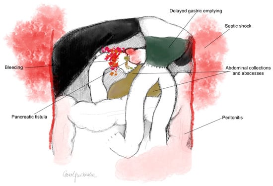 - Marchegiani, G.; Barreto, S.G.; Bannone, E.; Sarr, M.; Vollmer, C.M.; Connor, S.; Falconi, M.; Besselink, M.G.; Salvia, R.; Wolfgang, C.L.; et al. Postpancreatectomy Acute Pancreatitis (PPAP): Definition and Grading from the International Study Group for Pancreatic Surgery (ISGPS). Ann. Surg. 2022, 275, 663–672. [Google Scholar] [CrossRef] [PubMed]