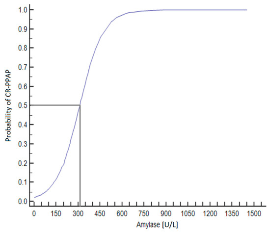 Predicted probability of CR-PPAP based on amylase values at 48 h after PD. 50% risk of developing CR-PPAP with amylase activity > 320 U/L.