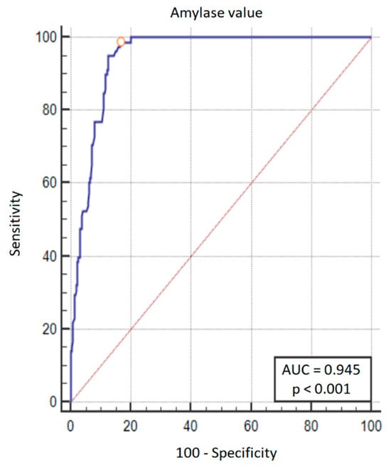 Amylase values at 48 h after PD were analyzed using ROC analysis to find the threshold value for the development of CR-PPAP. An amylase value > 161 U/L has a sensitivity of 98.7% and a specificity of 83.7% for the diagnosis of CR-PPAP (Figure 2 and Figure 3). An amylase value > 320 U/L indicates a 50% probability of CR-PPAP.