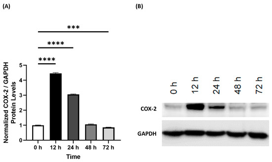 Human 3D EpiIntestinal tissue was treated with TNF-α/IFN-γ to induce an inflammatory response. At 12, 24, 48, and 72 h, the normalized densitometry of COX-2 protein level was measured relative to GAPDH (Figure 1) to determine the timeline of the inflammatory response of the 3D tissue to TNF-α/IFN-γ. After 12 h, relative COX-2 protein level was significantly higher than the control (p < 0.0001) and had the highest levels out of any timepoint (Figure 1). In addition, relative COX-2 levels were also significantly upregulated at 24 h (p < 0.0001, Figure 1A). In contrast, relative COX-2 levels were unaltered after 48 h and were significantly lower at 72 h compared to the control (p < 0.001, Figure 1A). Representative membranes of each timepoint were imaged and displayed in Figure 1B.