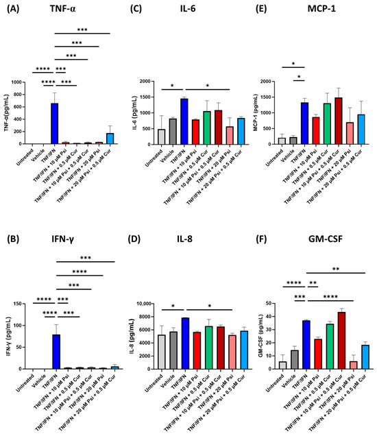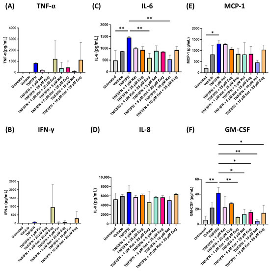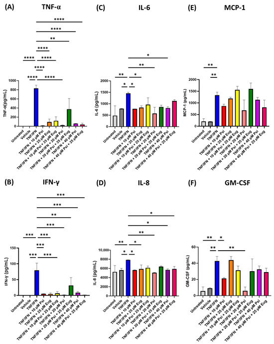 While all treatments significantly reduced TNF-α (p < 0.01, Figure 5A) and IFN-γ (p < 0.001, Figure 5B) compared to the TNF-α/IFN-γ group, only eugenol (25 μM) significantly lowered IL-6 levels (p < 0.05, Figure 5C). In contrast, none of the treatments significantly lowered IL-8 (p = N.S., Figure 5D), MCP-1 (p = N.S., Figure 5E), or GM-CSF (p = N.S., Figure 5F) compared to the TNF-α/IFN-γ group.