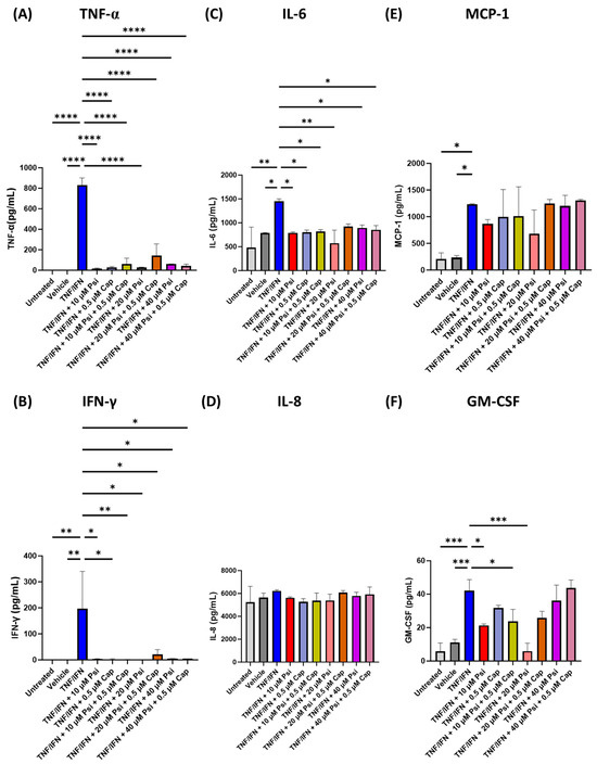 Next, we tested the anti-inflammatory effects of psilocybin combined with capsaicin. TNF-α (p < 0.0001, Figure 3A), IFN-γ (p < 0.05, Figure 3B), IL-6 (p < 0.05, Figure 3C), MCP-1 (p < 0.05, Figure 3E), and GM-CSF (p < 0.001, Figure 3F) were significantly higher in the TNF-α/IFN-γ group compared to the untreated group or vehicle. However, IL-8 levels were not significantly altered in the TNF-α/IFN-γ group compared to the control (p = N.S., Figure 3D).