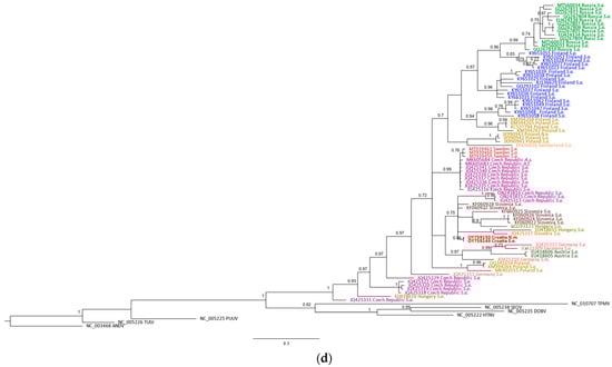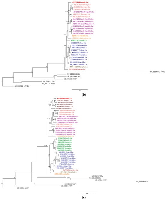 The overall phylogenetic analysis (Figure 1) showed that our sequences formed a distinct genetic lineage, with posterior probabilities of 0.86–1. For the S segment’s complete ORF analysis (Figure 1b), Slovenian sequences were excluded due to incomplete coverage of sequences deposited in NCBI GenBank. Complete ORF phylogenetic analyses (Figure 1b) resulted in a better-resolved tree, which, when compared to analyses of partial sequences (Figure 1c,d), had higher posterior probability values. Analyses of partial sequences placed Croatian sequences as the most closely related to those from neighboring Slovenia and Hungary, as well as to those from Central Europe (Czech Republic and Slovakia). Our sequence clustered exclusively with Slovenian sequences in the partial S-segment-based phylogeny, and was proven to be most closely related to Slovenian Notranjsko-Kraska Podravska genetic lineage (Acc no: KF060929 and KF060934) (Figure 1c). The ML tree results support Bayesian-derived phylogeny (Supplementary Figure S1).